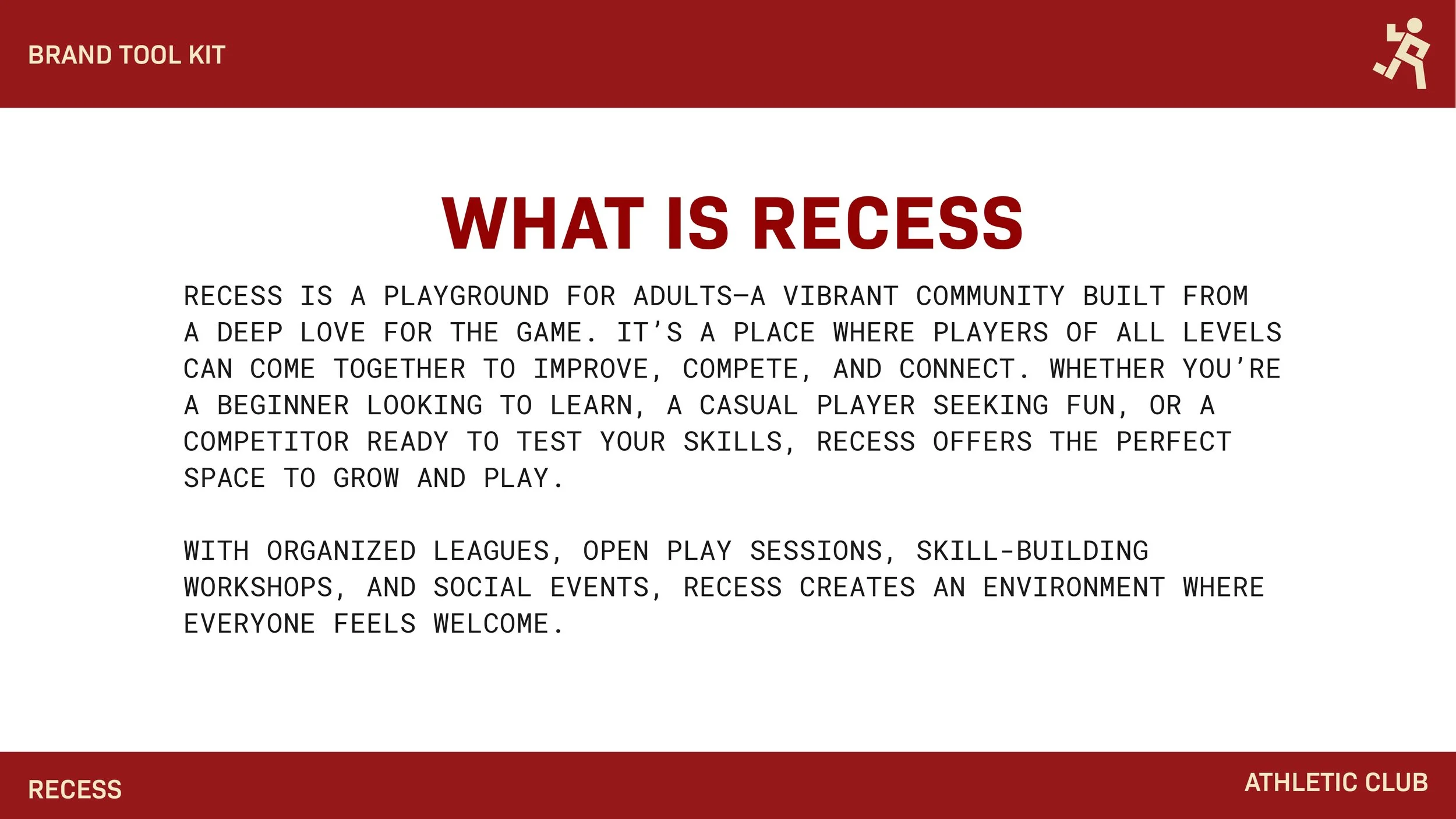 Recess brought me in to refresh their brand identity and help them better connect with their audience. With their existing logo, I helped redesign their wordmark to feel more modern and luxurious. I built out a cohesive color palette and defined their voice and tone so it felt true to who they are. Along the way, I worked closely with their team to ensure everything, from visuals to messaging, aligned with where they wanted to go as a brand.